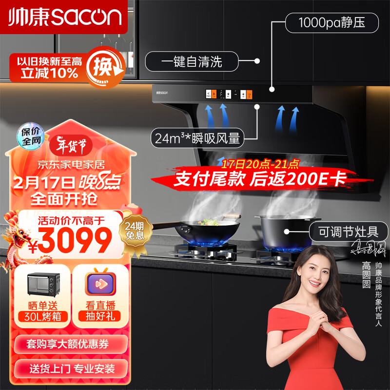 帅康(Sacon)顶侧双吸油烟机 变频静音24m3爆炒风量7字机油烟机燃气灶套装 Y8275+可调节灶LB850B1(液化气)价格:3099.00元!