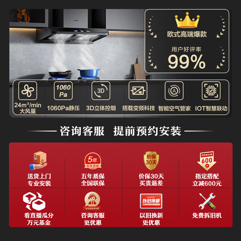 说实话这款老板62D3S烟灶套装很喜欢这个外观,质量挺好的,客服的服务真的很好,回答问题耐心细致,让我感到很贴心。