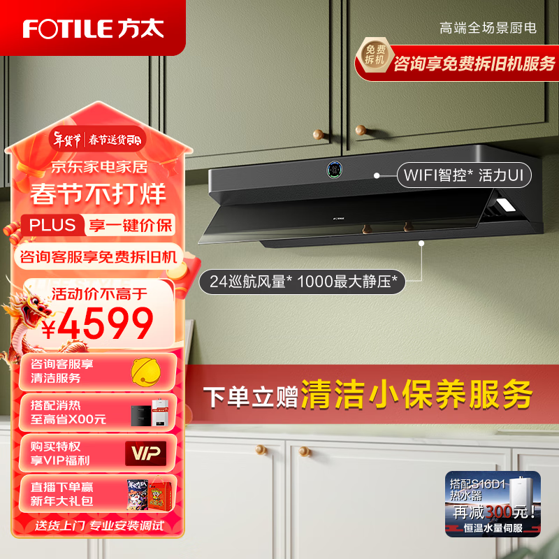 方太(FOTILE)欧式顶吸式抽吸油烟机 顶侧一体 24大风量 直流变频 家用厨房脱排油烟机 F2.i价格:4599.00元!