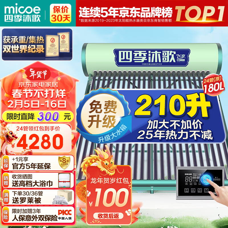 四季沐歌(MICOE)飞享太阳能热水器家用光电两用自动上水 预约电加热 水温水位显示 一级能效 送+装 24管180L价格:4680.00元!