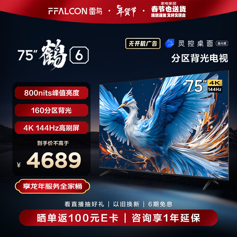 FFALCON雷鸟 鹤6 24款 75英寸游戏电视 144Hz高刷 4K 4+64GB 智能液晶平板电视机以旧换新75S575C PRO价格:4689.00元!