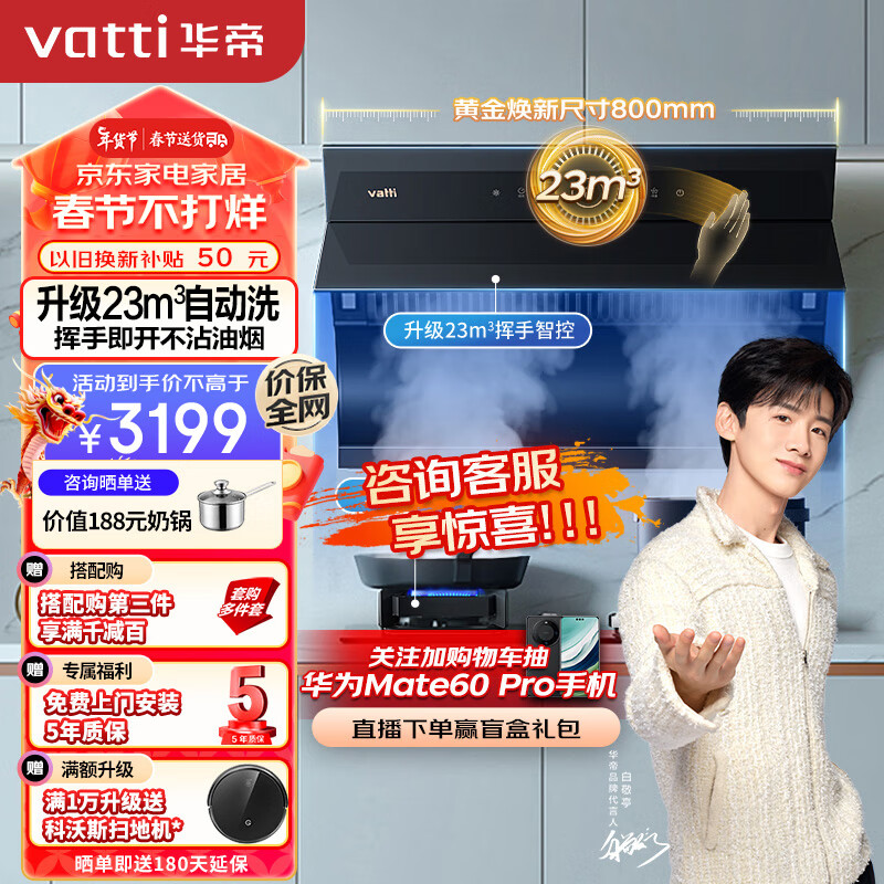 华帝(VATTI)抽油烟机家用大吸力小尺寸烟机燃气灶烟灶套装23风量自动清洗侧吸吸油烟机灶具套装i11170天然气价格:3199.00元!