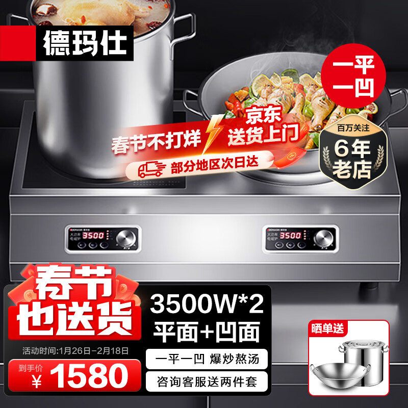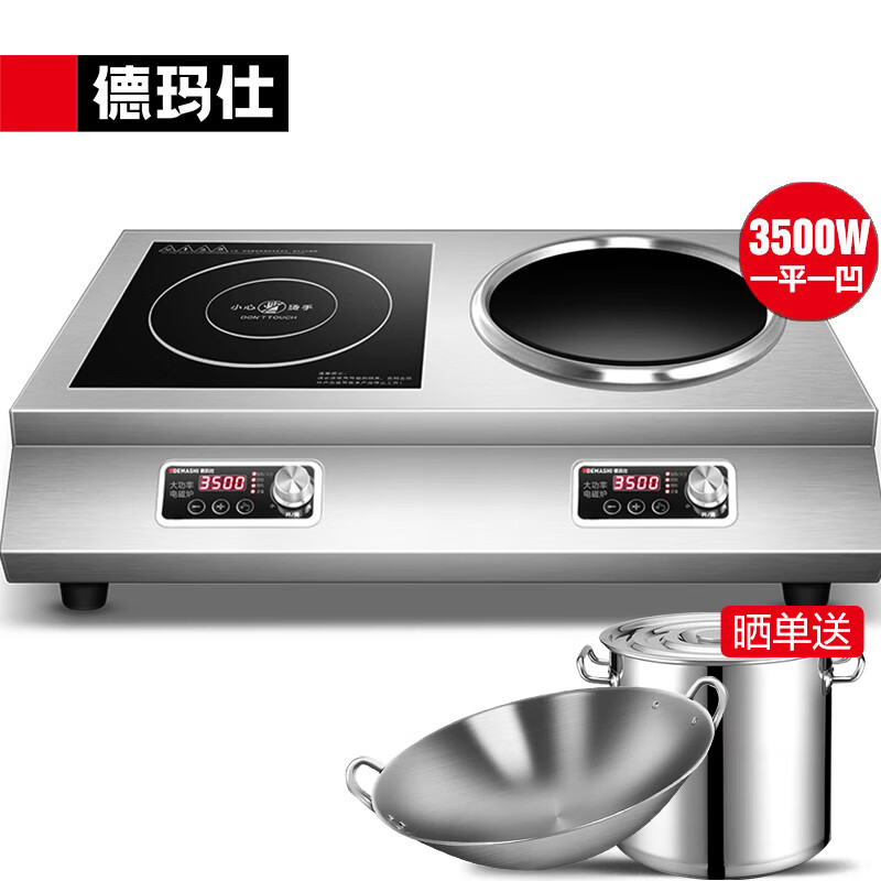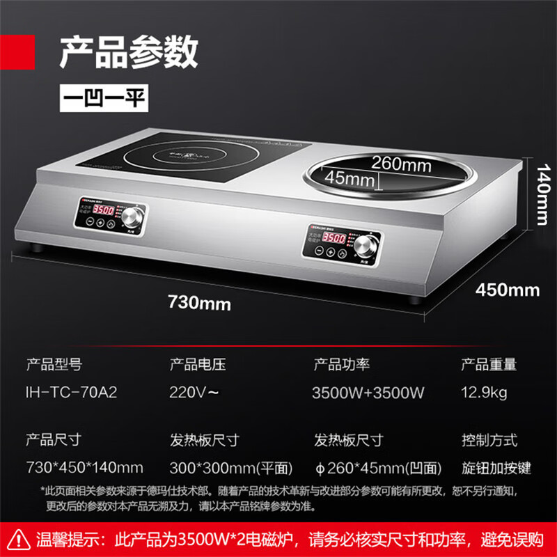 德玛仕(DEMASHI)商用电磁炉3500W大功率多头电磁炉平面凹面双头炉灶 台式多眼多头双灶电磁灶 一平一凹IH-TC-70A2价格:1580.00元!