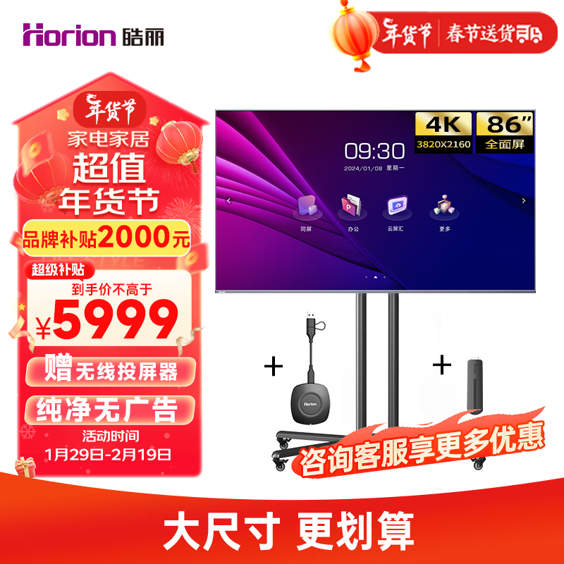 皓丽(Horion)会议电视86英寸4K会议平板一体机商用显示会议室智慧屏投影投屏移动培训大屏86H5移动支架套装价格:5999.00元!