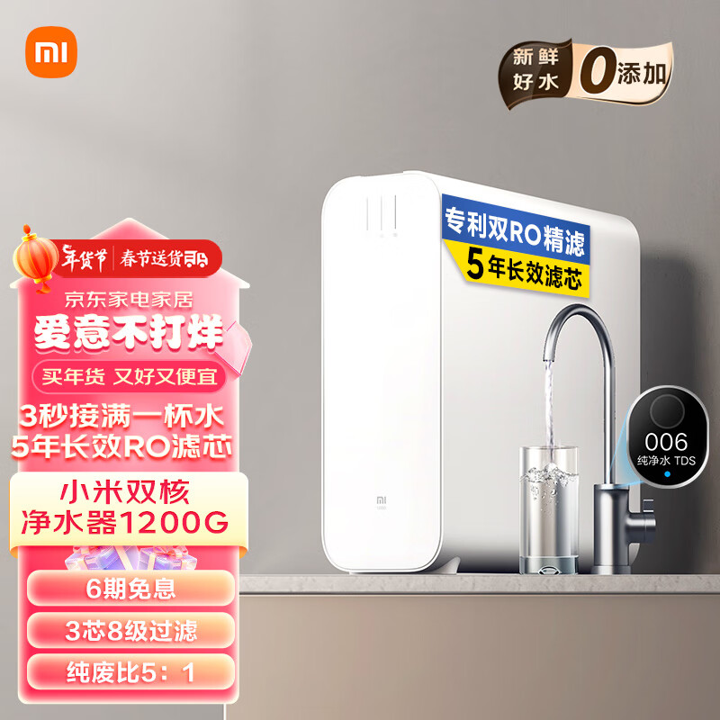 米家小米双核净水器1200G家用净水机 厨下式直饮机 无罐直饮水 5年长效RO滤芯 5:1纯废水比 3.2L/分价格:2999.00元!