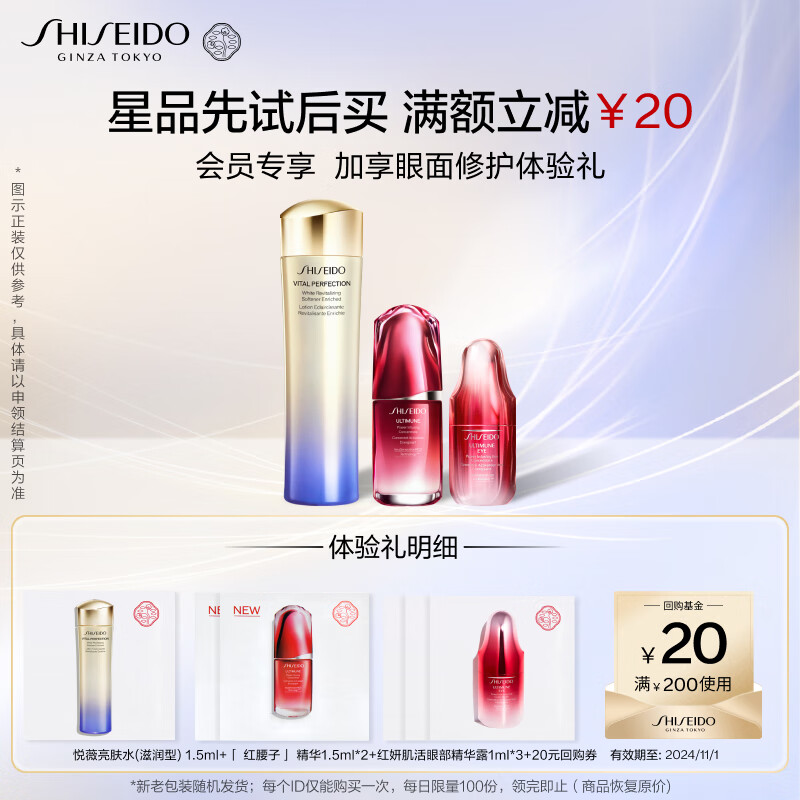 资生堂(SHISEIDO)红腰子眼精华+红腰子精华+悦薇滋润水体验装 有效期至2024/11/1价格:180.00元!