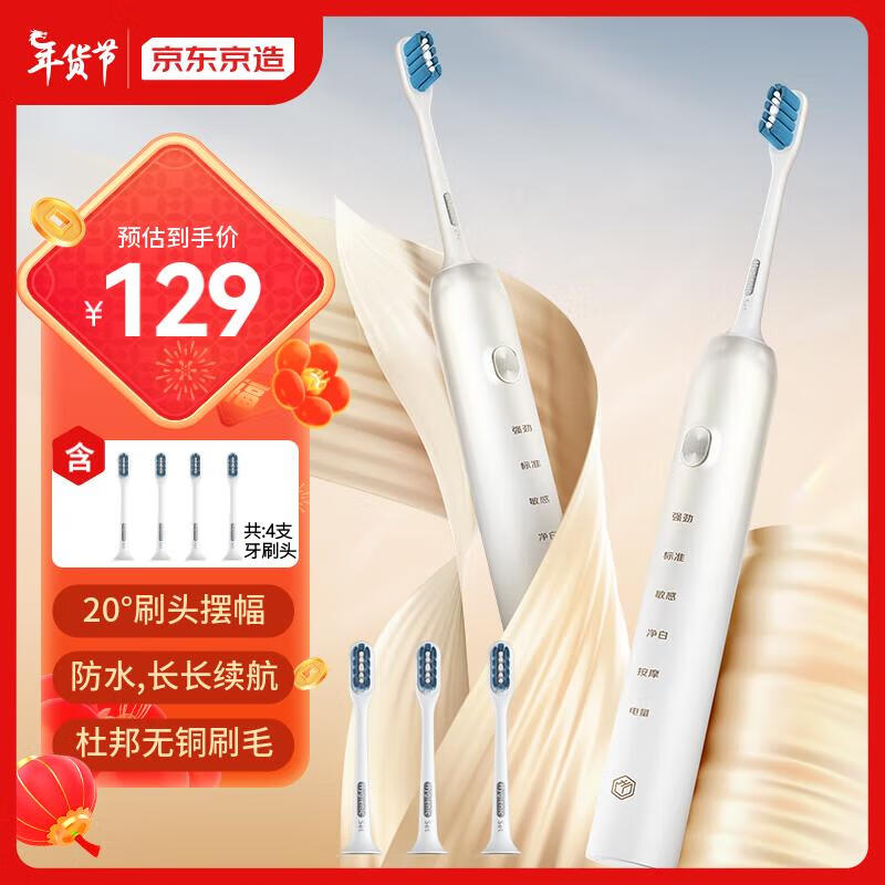 京东京造 声波电动牙刷成人JZ7 5种模式超长续航 4支无铜褪色刷头牙刷电动牙刷情侣 春节男生生日礼物 男价格:129.00元!