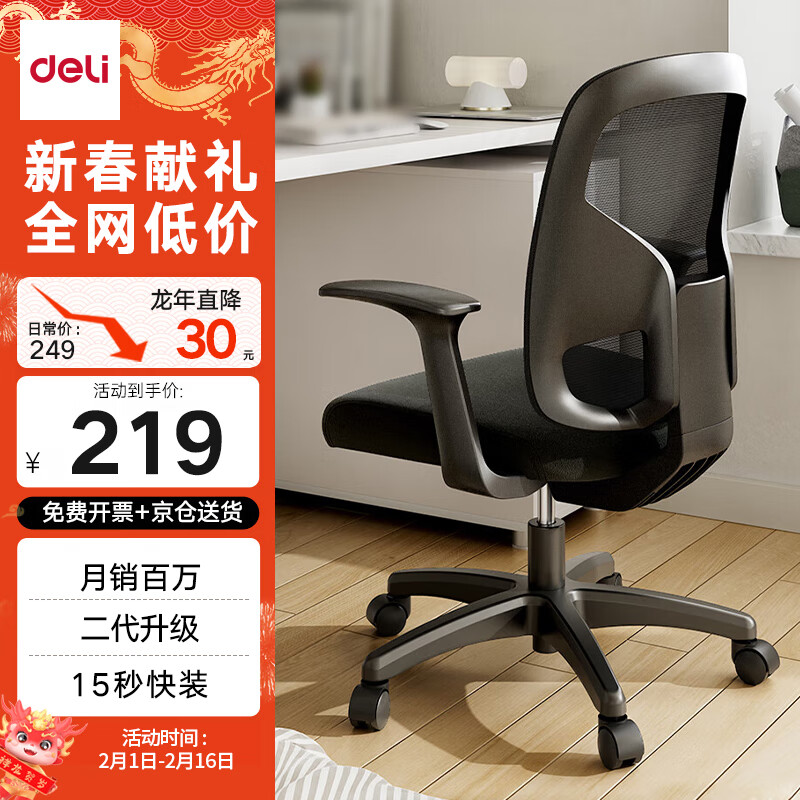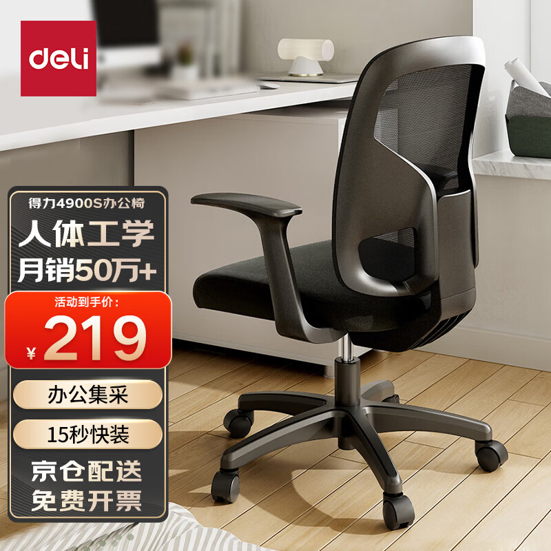 得力(deli)4900S 人体工学靠背办公椅/电脑椅/职员椅 家用网布可升降转椅 黑价格:249.00元!