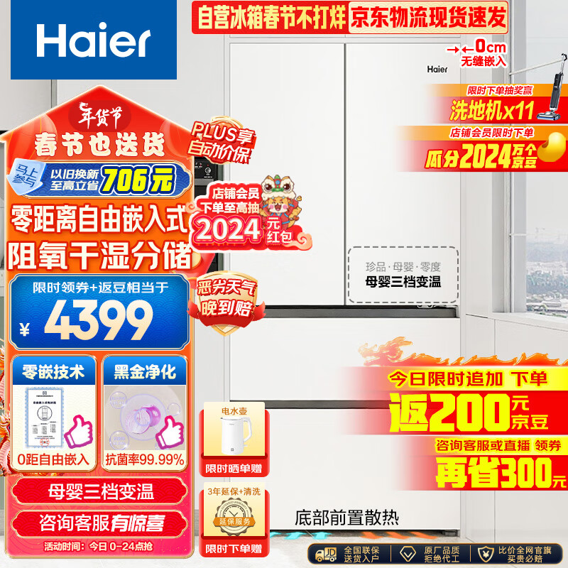 海尔(Haier)460L零距离自由嵌入多门四开门法式电冰箱家用白色一级能效超薄嵌入式底部散热BCD-460WGHFD4DW9U1价格:5099.00元!