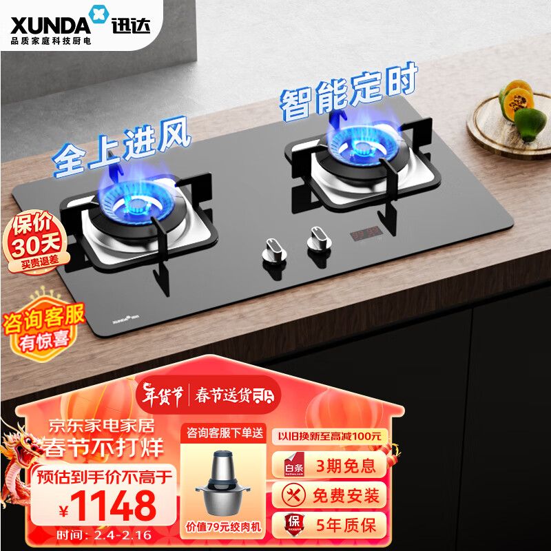 迅达(XUNDA)燃气灶液化气灶家用 煤气灶双灶具 嵌入式台式两用 4.1KW旋流猛火灶 定时可拆卸炉头 F3-液化气价格:1248.00元!