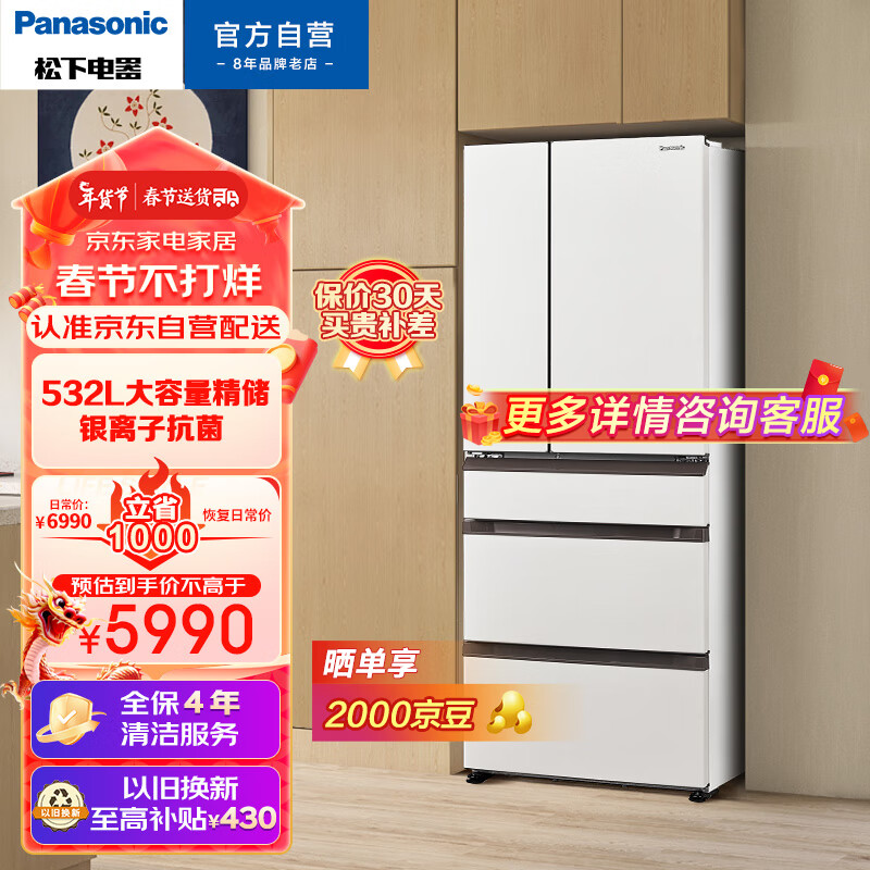 松下(Panasonic)532升家用大容量多门冰箱 银离子kang菌 变频无霜风冷NR-JE54WGC-W价格:5990.00元!