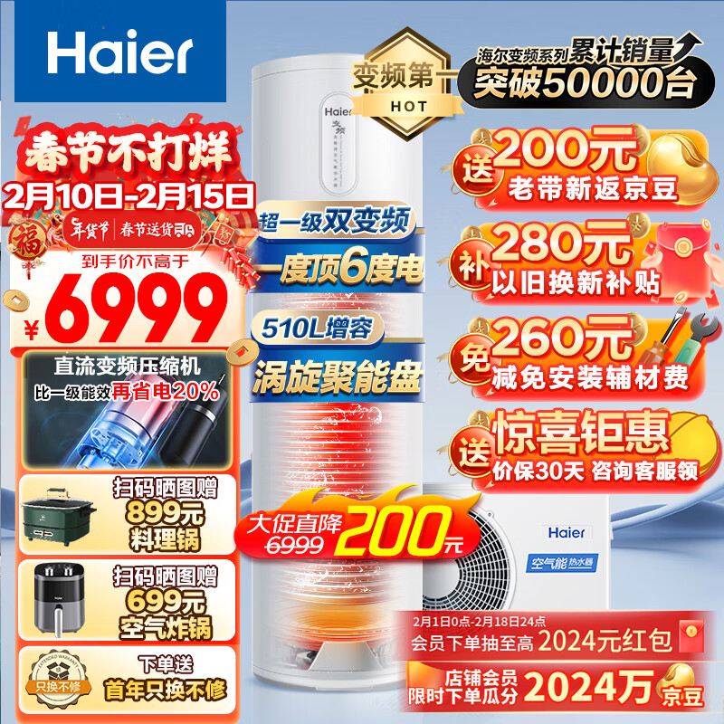 海尔(Haier)空气能热水器200升包安装 超一级能效全变频节能电辅 80℃高水温抑垢净水洗WIFI智控FJE7(4-6人)价格:6999.00元!