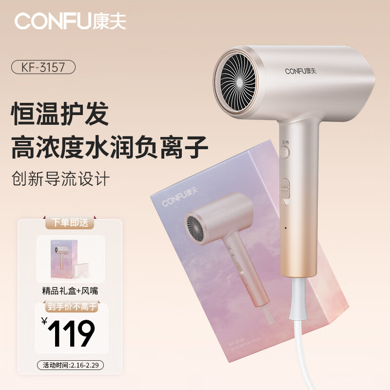 康夫(CONFU)电吹风机大功率1800W速干负离子护发宿舍家用生日礼物送女友吹风筒 KF-3157香槟金价格:149.00元!