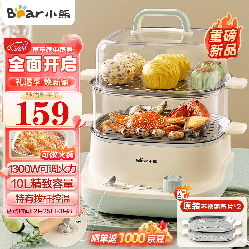 小熊(Bear)电蒸锅 小火锅电锅2-3人 蒸锅家用 10L多功能早餐包子电热煮锅定时可调火力不锈钢蒸盘DZG-CA0H1价格:159.00元!