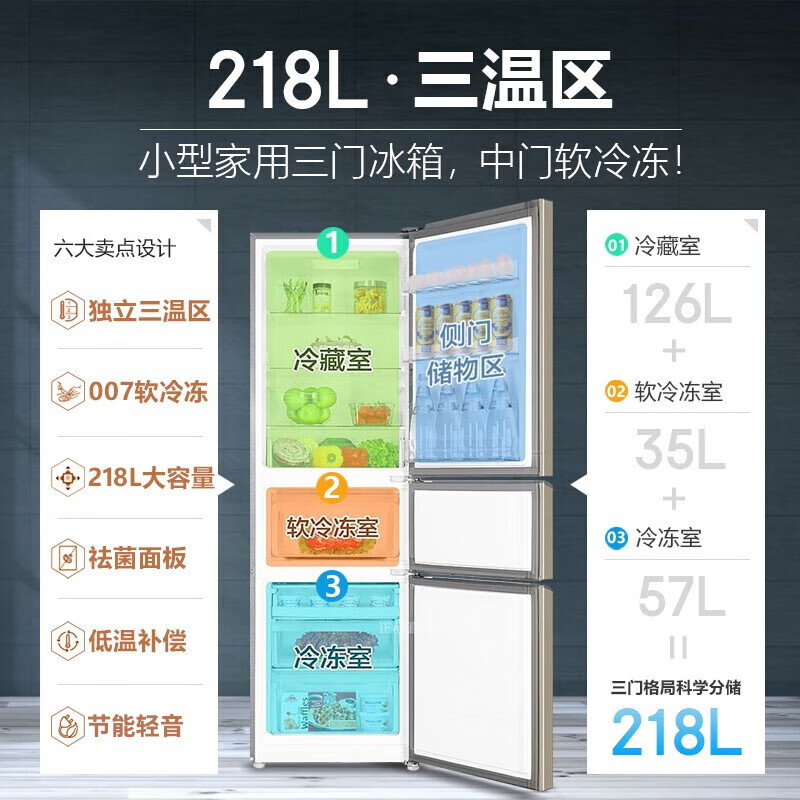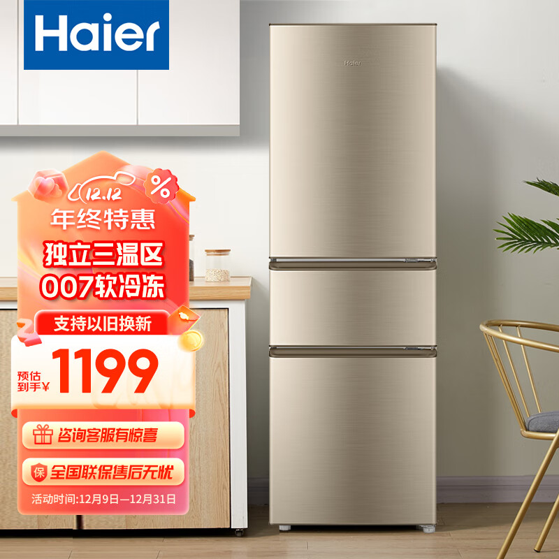 海尔(Haier)冰箱218升三门家用中超薄小型宿舍租房节能省电中门软冷冻电冰箱BCD-218STPS价格:1199.00元!
