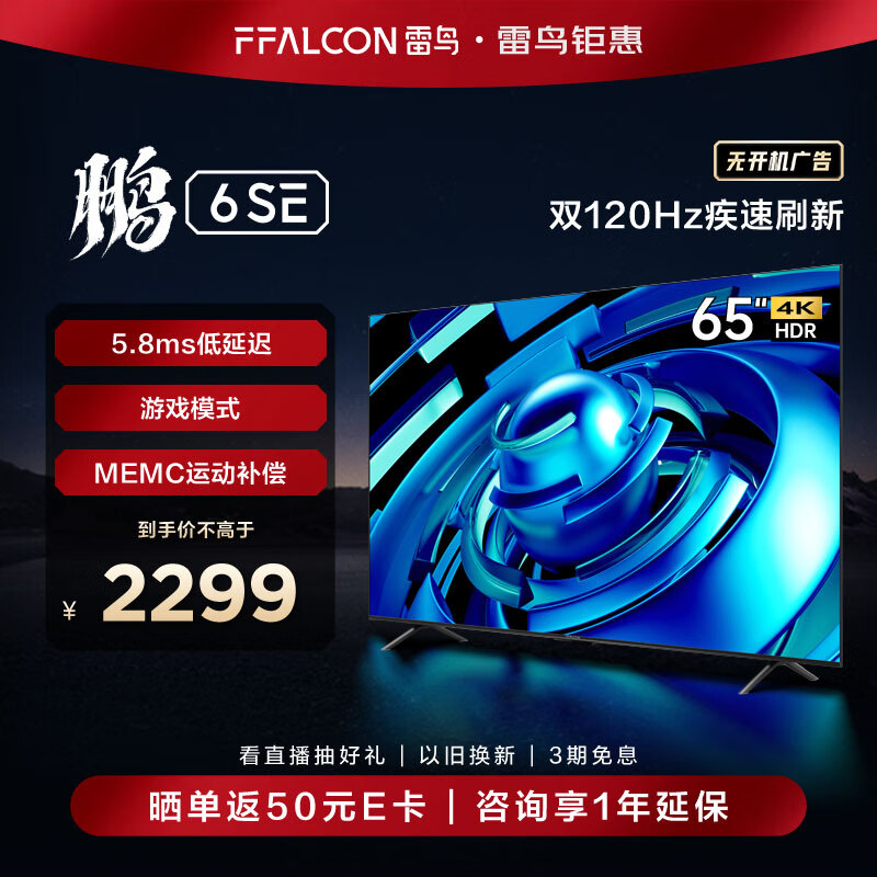 FFALCON雷鸟 鹏6SE 65英寸游戏电视 4K超薄屏 MEMC防抖 远场语音 2+32G 智能液晶平板电视机65S365C价格:2299.00元!