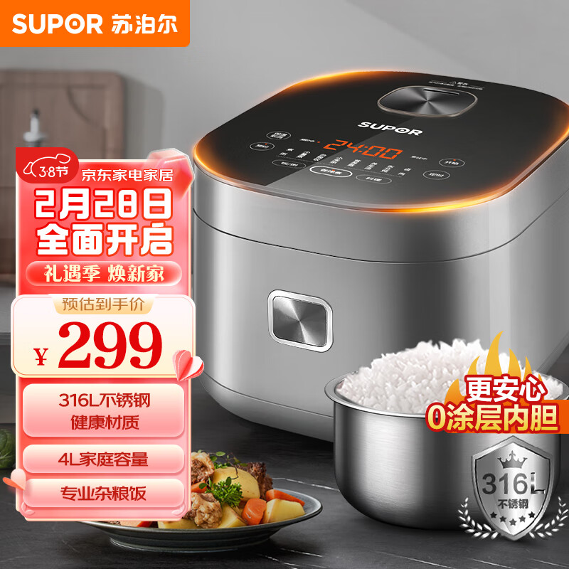 苏泊尔(SUPOR)电饭煲 0涂层电饭锅4L不锈钢内胆2-6人 家用智能多功能无涂层电饭煲SF40FC9001价格:299.00元!