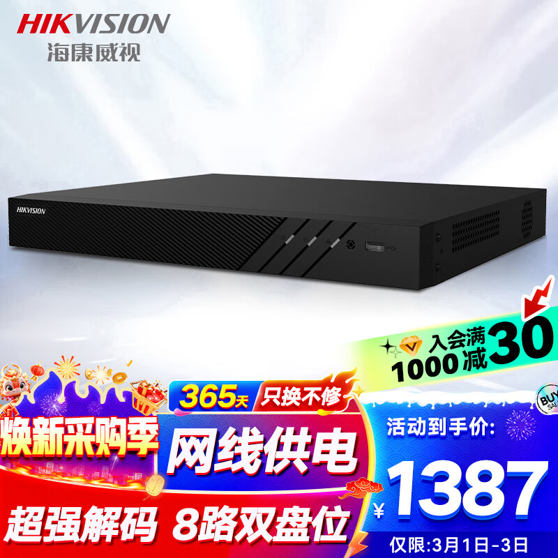 HIKVISION海康威视网络监控硬盘录像机 8路2盘位poe网线供电NVR 4K高清主机DS-7808N-R2/8P价格:1417.00元!