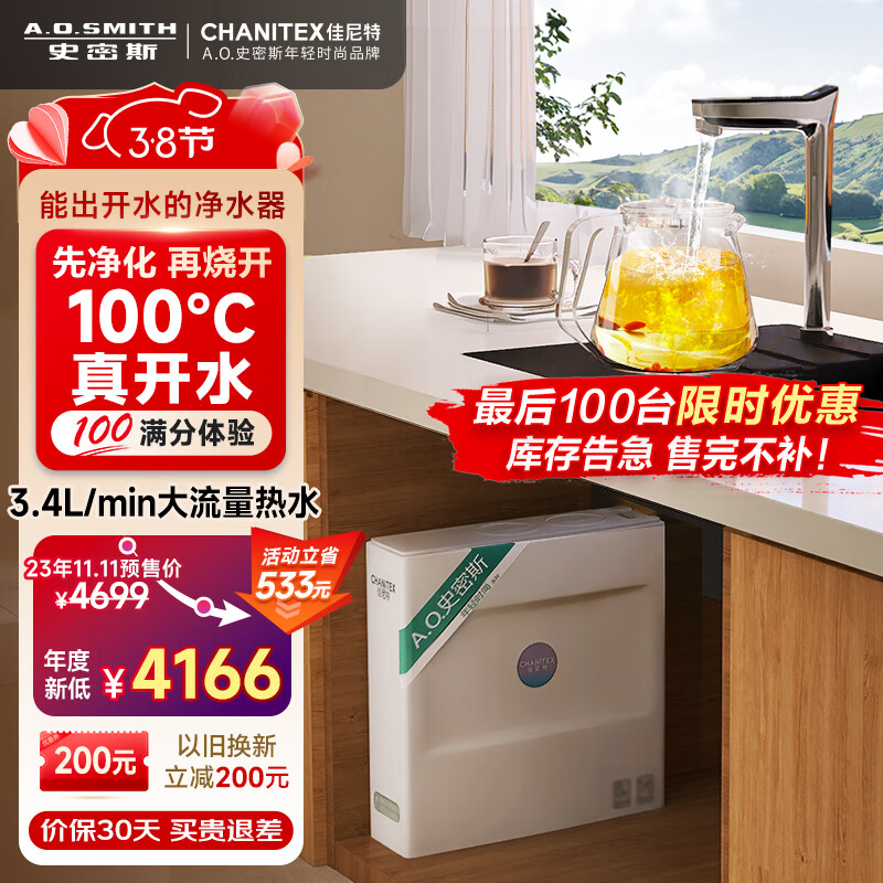 史密斯(A.O.SMITH)佳尼特能出开水的净水器厨下加热家用净水机热水3.4升/分钟多档控温0陈水CAR600-FA1 以旧换新价格:4166.00元!