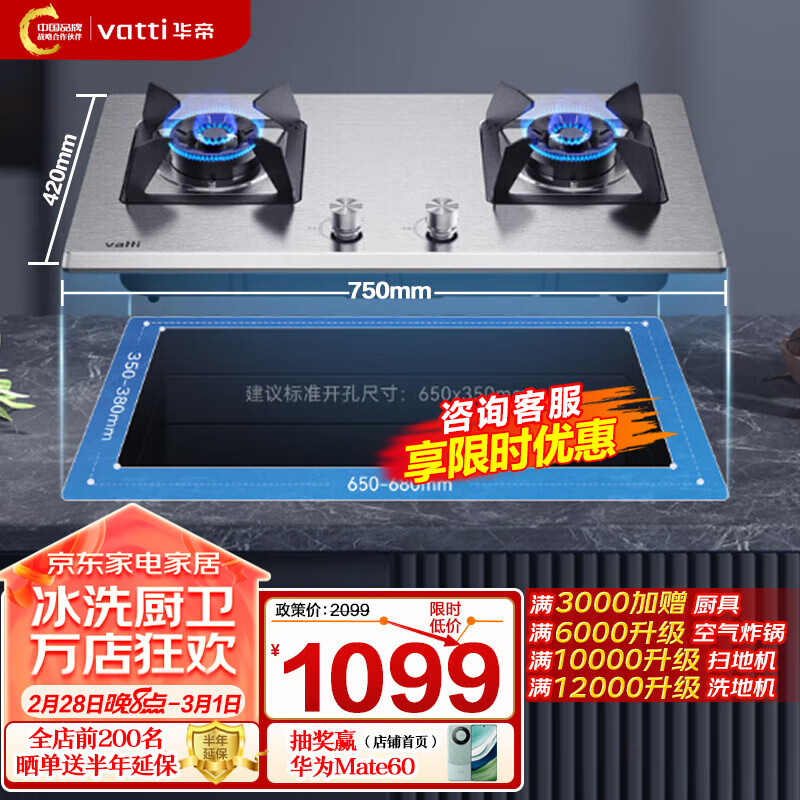 华帝(VATTI)燃气灶天然气双灶具5.0kw大火力华帝官方家用不锈钢灶具台嵌两用双炉头一级能效可调节底盘i10065A 液化气5.0kW价格:1599.00元!
