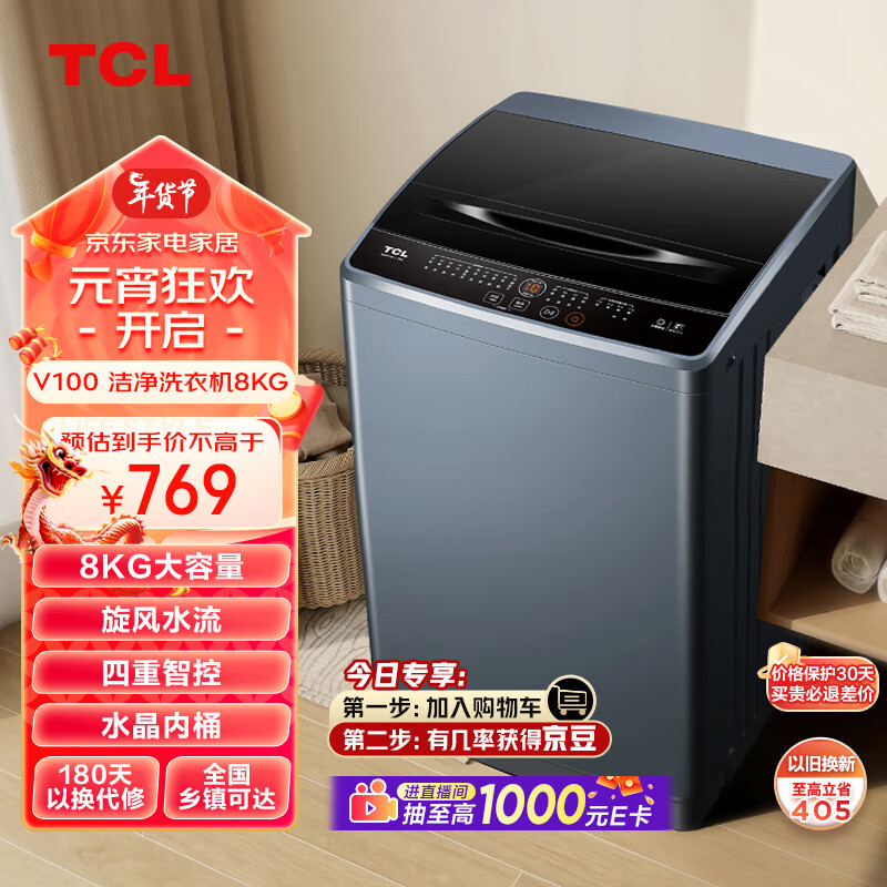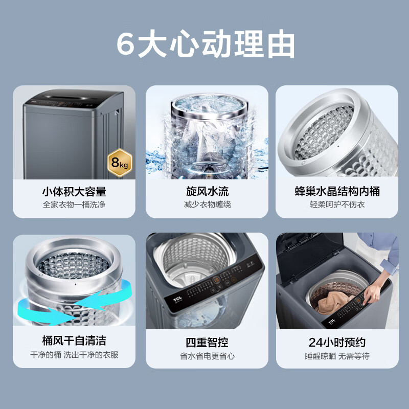 TCL 8KG洁净护衣洗衣机V100大容量波轮 旋风水流 租房神器 桶风干自清洁 超薄机身一键脱水B80V100价格:769.00元!