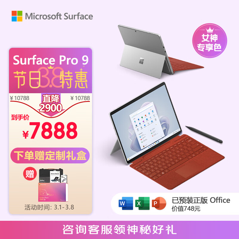 微软Surface Pro 9 亮铂金+波比红带触控笔键盘盖 i5 8G+256G 二合一学生电脑 13英寸120Hz 平板笔记本价格:7888.00元!
