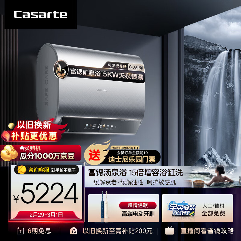卡萨帝(Casarte)60升5kw速热家用储水式电热水器超薄双胆扁桶隐藏安装浴缸洗富锶泉一级能效CEC6007HD-CJ11AEKU1价格:5489.00元!