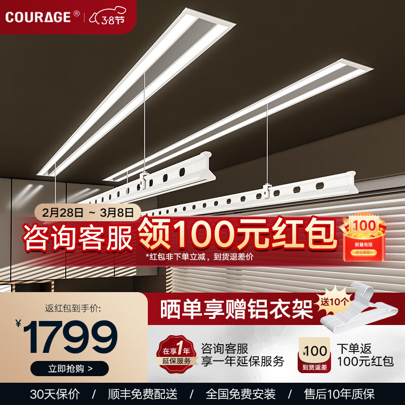 卡瑞琪(COURAGE)电动晾衣架隐形阳台家用隐藏式晾衣架多功能晾衣杆双杆 米家2.4米价格:2899.00元!