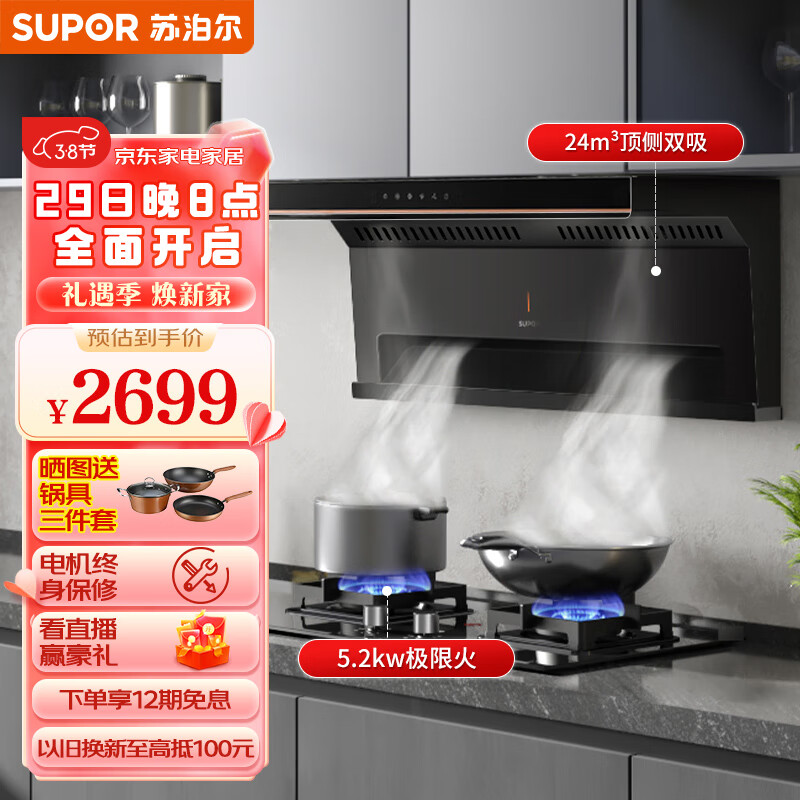 苏泊尔(SUPOR)抽油烟机 双腔拢烟顶侧双吸油烟机灶具套装 24立方大吸力变频烟灶 家用油烟机燃气灶 DL35+DB70天价格:2699.00元!