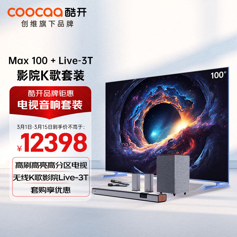酷开创维Max100 100英寸电视 高刷高亮高分区电视机+无线K歌影院Live-3T 家庭KTV环绕音响 回音壁套装价格:12398.00元!