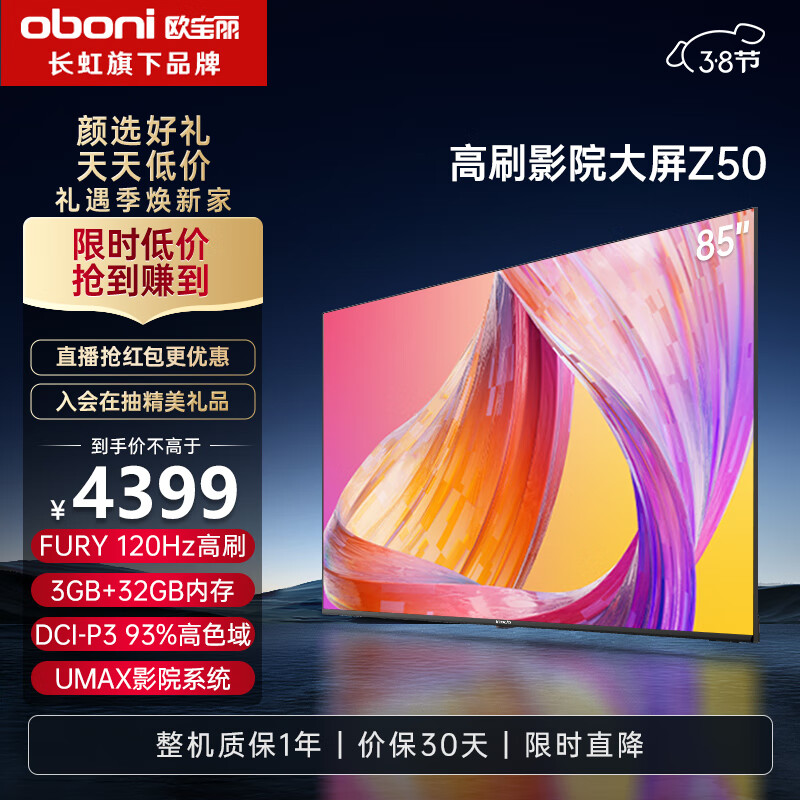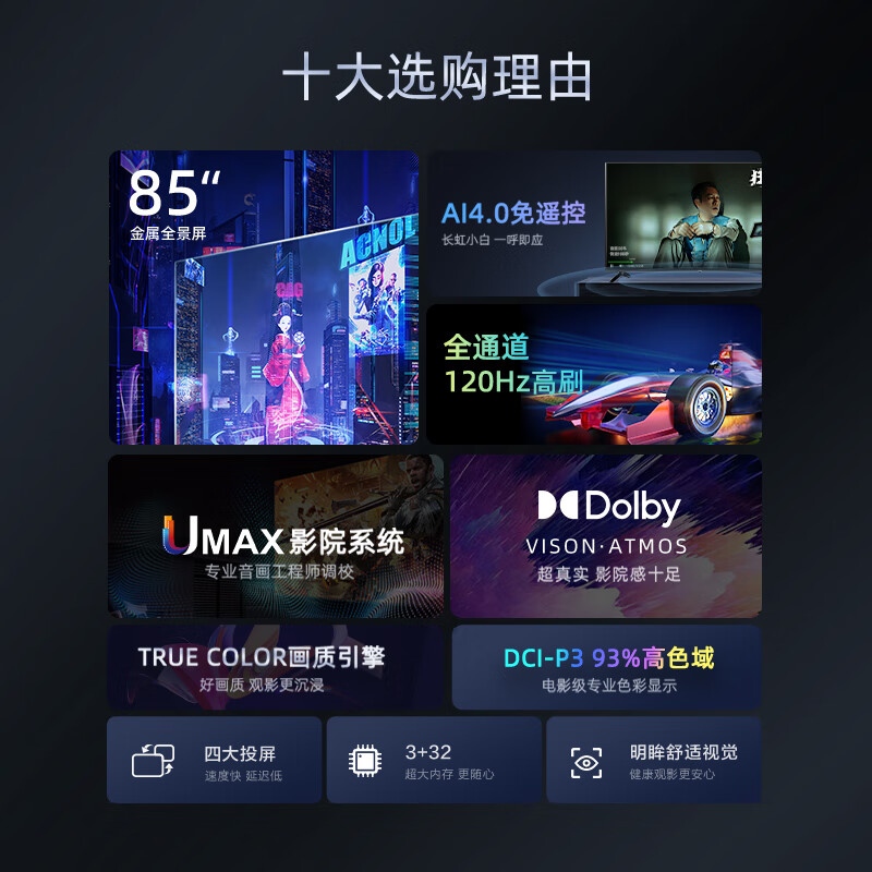 长虹欧宝丽85Z50?85英寸4K超清120Hz高刷?3+32GB?93%P3影院级高色域?杜比音画?智能平板液晶LED电视机价格:4398.00元!