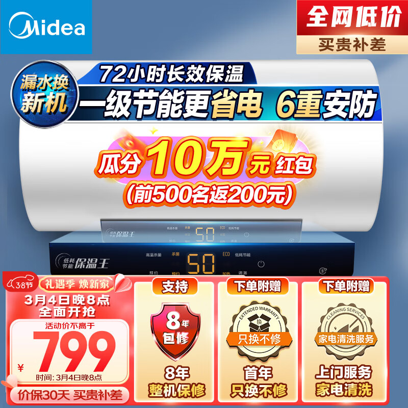 美的(Midea)热水器家用2200W速热可预约低耗节能72小时保温6重安防50升储水式电热水器F5022-M3(H)价格:749.00元!