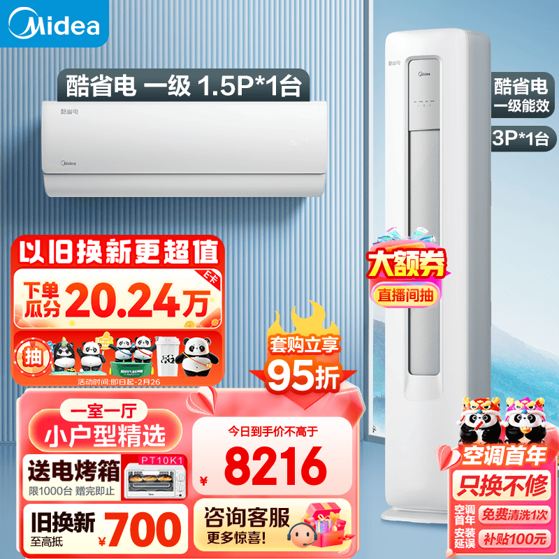 美的(Midea)新一级能效 酷省电 空调套装 一室一厅 小户型精选(1.5匹酷省电+3匹酷省电)价格:8648.00元!