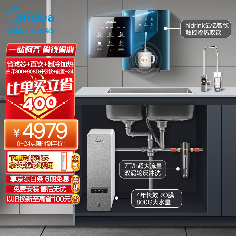 美的(Midea)省芯直饮冷热净水器套装【白泽800+管线机908D+前置-24pro】hidrink智能 壁挂式加热一体净饮机价格:4979.00元!