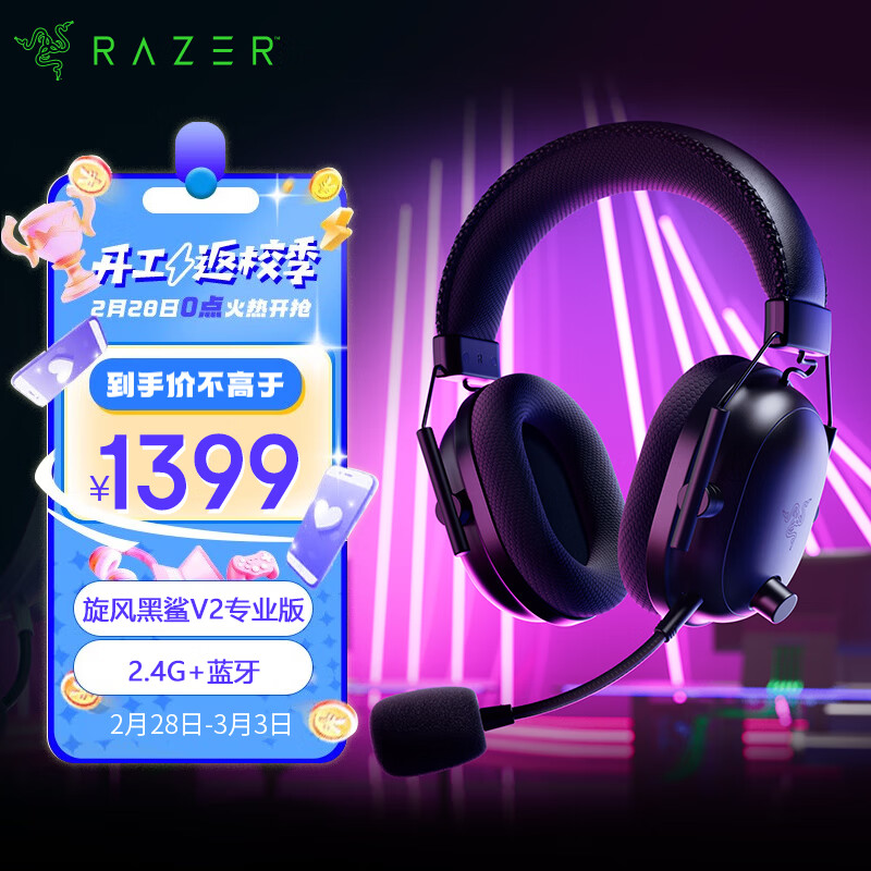 雷蛇(Razer)旋风黑鲨V2专业版2.4G+蓝牙 无线头戴式电竞游戏耳机耳麦 双模连接 被动降噪 吃鸡神器 黑色价格:1399.00元!