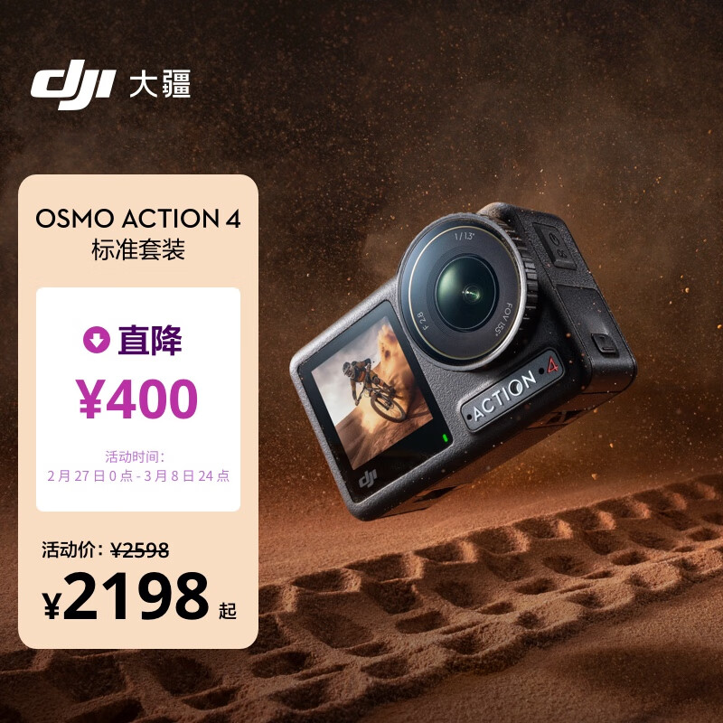 大疆 DJI Osmo Action 4 标准套装 灵眸运动相机 摩托车山地公路骑行潜水户外vlog相机 + 128G内存卡价格:2287.90元!