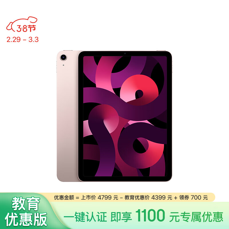 Apple/苹果【教育优惠】 iPad Air 10.9英寸平板电脑 2022款(64G WLAN版/MM9D3CH/A)粉色价格:4399.00元!