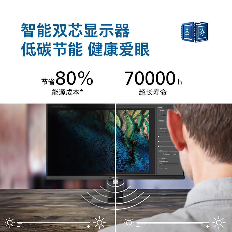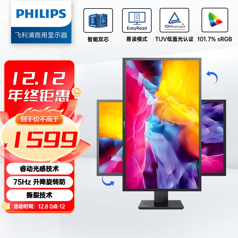 飞利浦 31.5英寸显示器 IPS屏2K高清办公10Bit 升降旋转竖屏 低蓝光护眼电脑显示屏 智能双芯325B1LN价格:1599.00元!