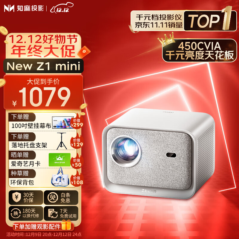 知麻New Z1 mini 2023款 投影仪家用 投影机卧室客厅 智能家庭影院芝麻(450 CVIA流明 全自动校正 全域清晰)价格:1099.00元!