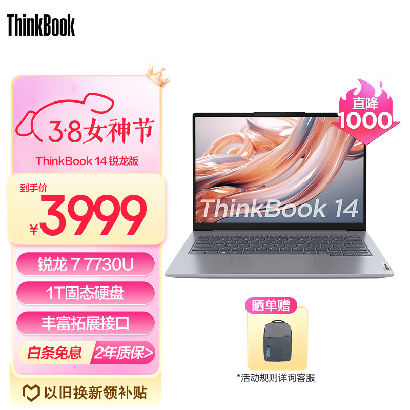 ThinkPad联想ThinkBook 14/16锐龙版 商务轻薄笔记本电脑 14英寸:R7-7730U 16G 1T 24CD价格:4999.00元!