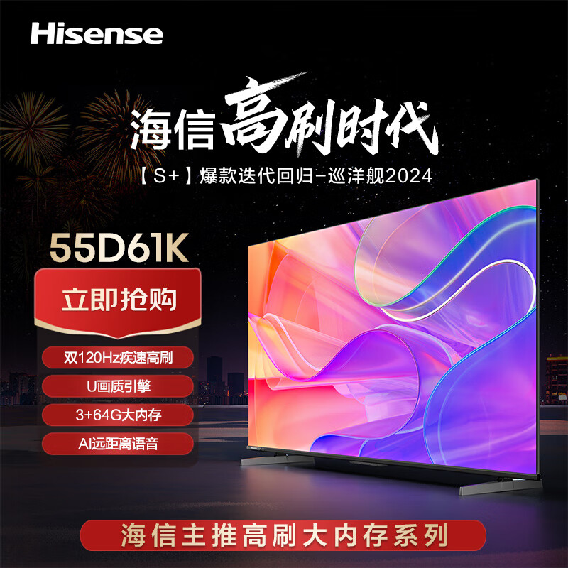 海信电视 55D61K 55英寸 3+64GB大内存AI智能语音 120Hz疾速刷新 U画质引擎价格:4599.00元!