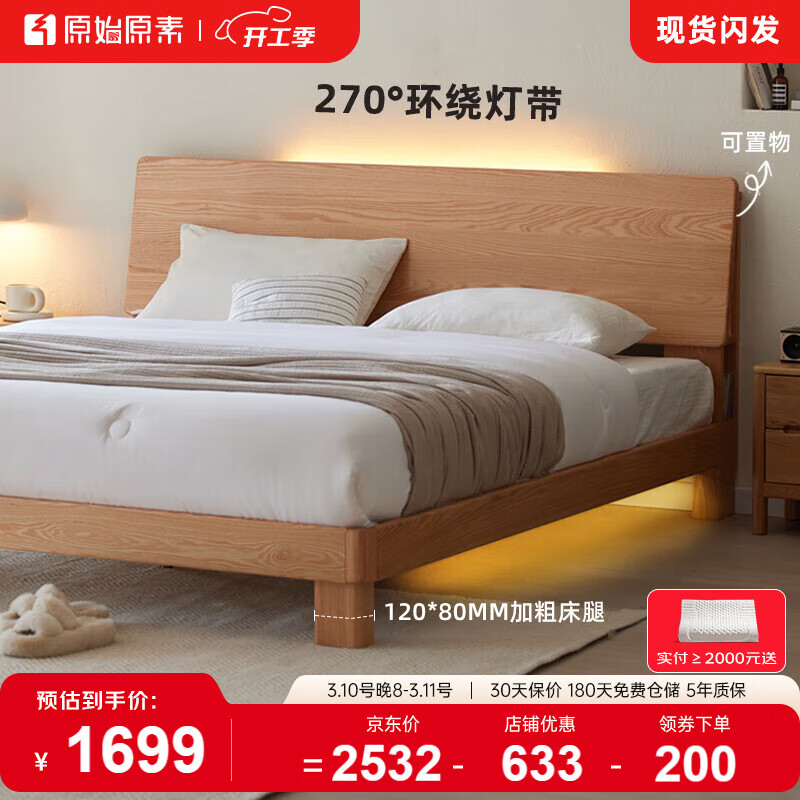 原始原素实木床现代简约1.5米橡木大床北欧夜灯双人床JD1856-低体价格:2532.00元!