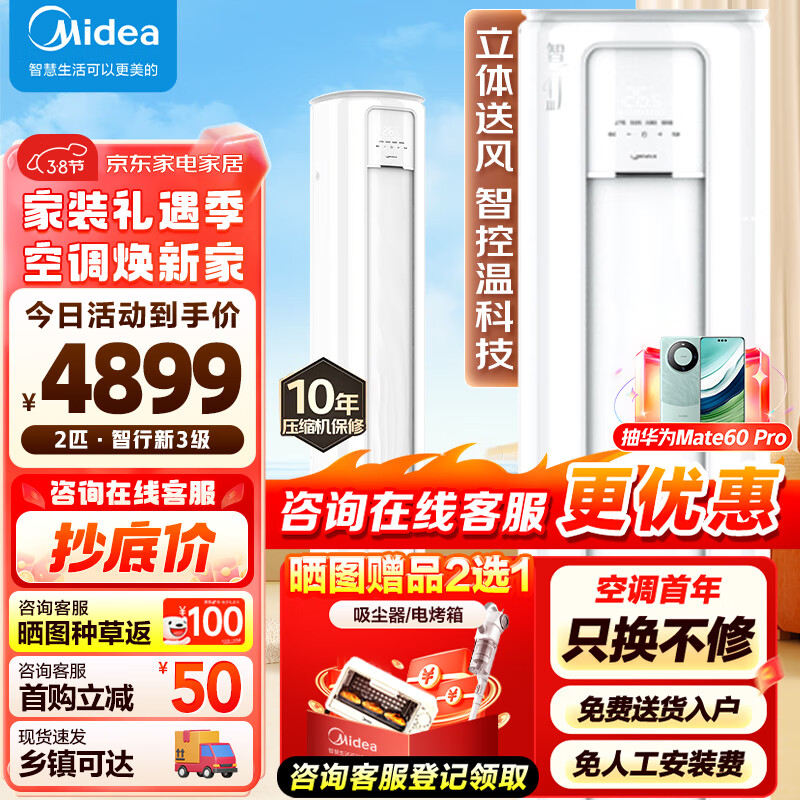 美的(Midea)2匹柜机空调 智行三代 新三级能效 变频冷暖 客厅立式空调柜机KFR-51LW/BDN8Y-YC400(3)A 立体送风价格:4899.00元!
