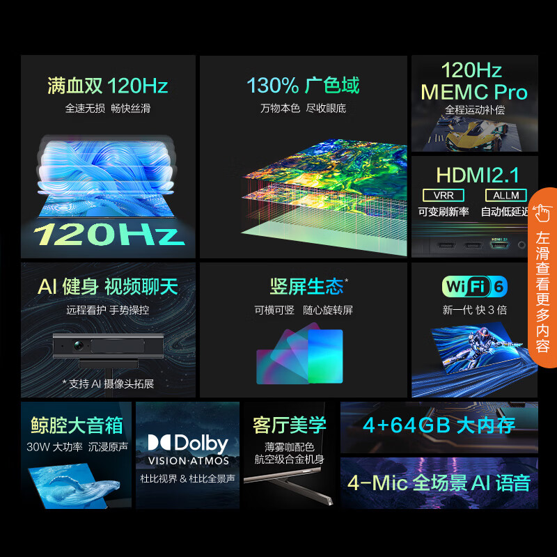 康佳电视 65R6 65英寸 120Hz高刷新 WIfi6 4+64GB 4K超清屏 智能网络 旋转屏 液晶平板游戏电视机价格:8999.00元!