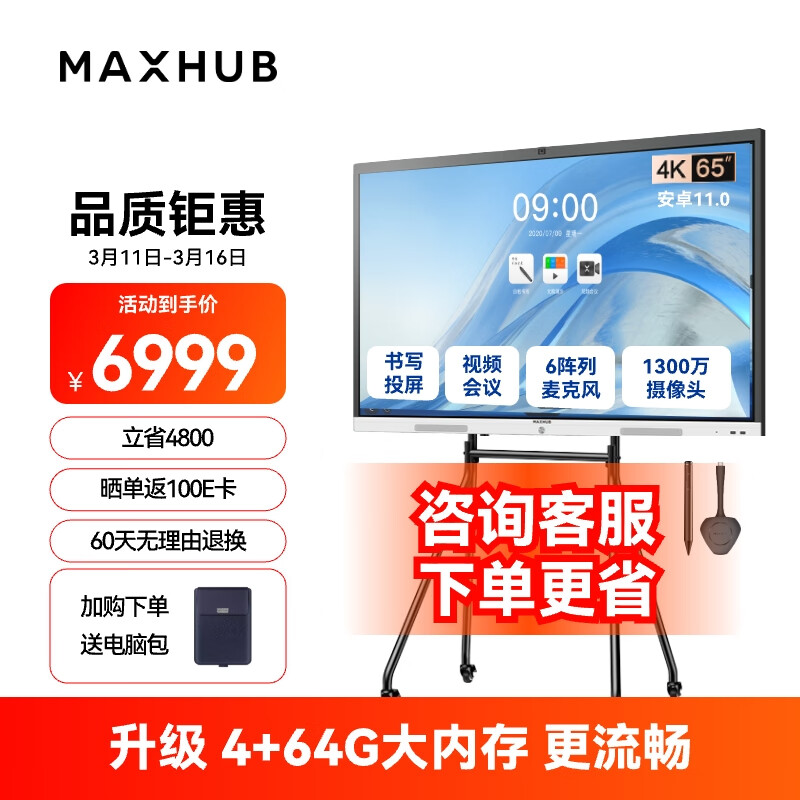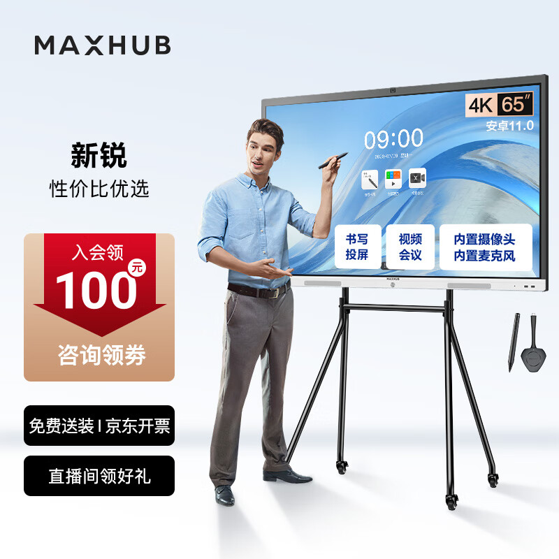 maxhub视频会议平板一体机电子白板教学触控书写投屏内置摄像头麦克风新锐65安卓+时尚支架+投屏+笔价格:6999.00元!