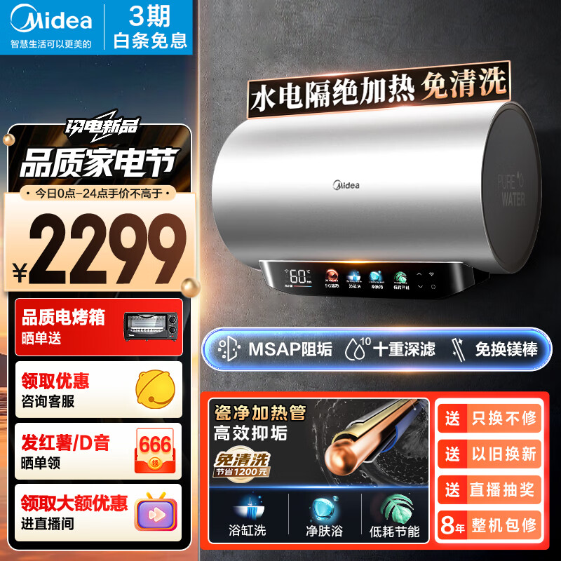 美的(Midea)水电分离80升电热水器家用 3300W变频 10重过滤净肤 瓷净舱除余氯 内胆免清洗F8033-PE9(HE)价格:2499.00元!