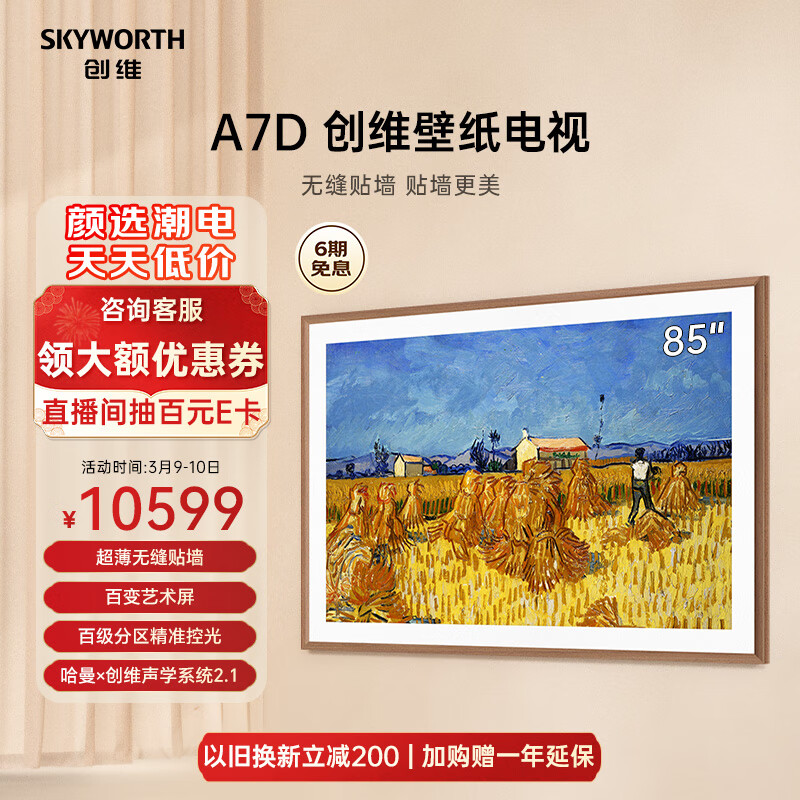 创维壁纸电视85A7D 85英寸 龙年定制超薄壁画艺术电视机 无缝贴墙百变艺术屏4K超高清护眼超薄巨幕大屏价格:10599.00元!
