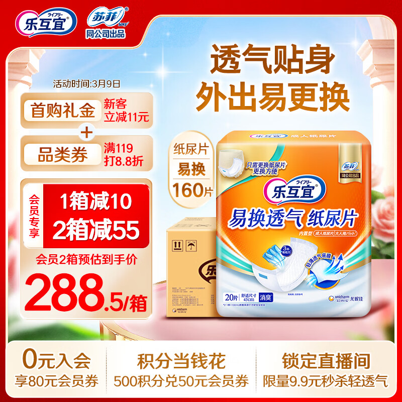 乐互宜易换透气成人纸尿片产褥垫老年人孕妇安心43*22cm箱装160片价格:359.00元!