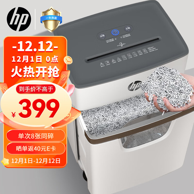 惠普(HP)5级保密中型多功能商用碎纸机专业销毁粉碎机(单次8张 20L 可碎卡碎订书针 米粒级碎纸 )W2008MC价格:459.00元!