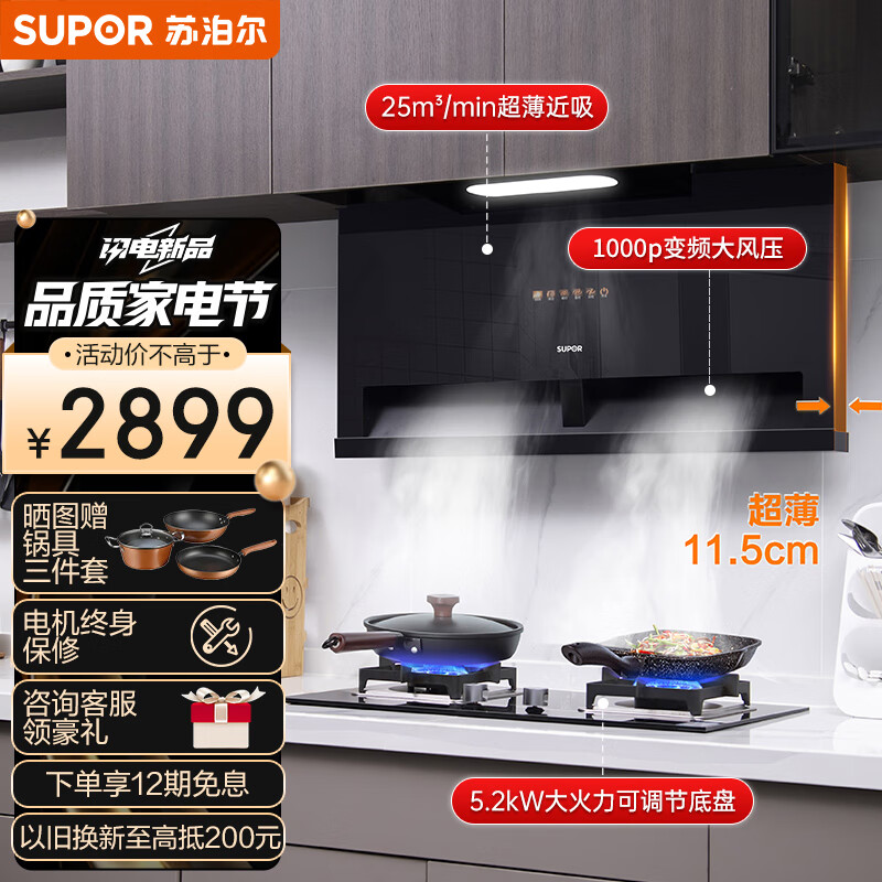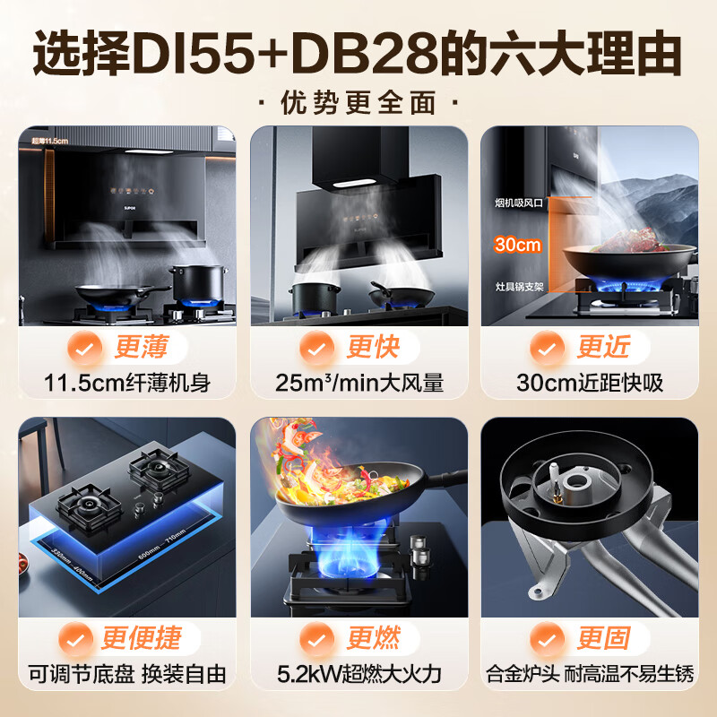 苏泊尔(SUPOR)抽油烟机燃气灶烟灶套装 25立方大吸力超薄低吸1000pa变频挥手智旋干洗DI55+DB28液化气价格:3099.00元!